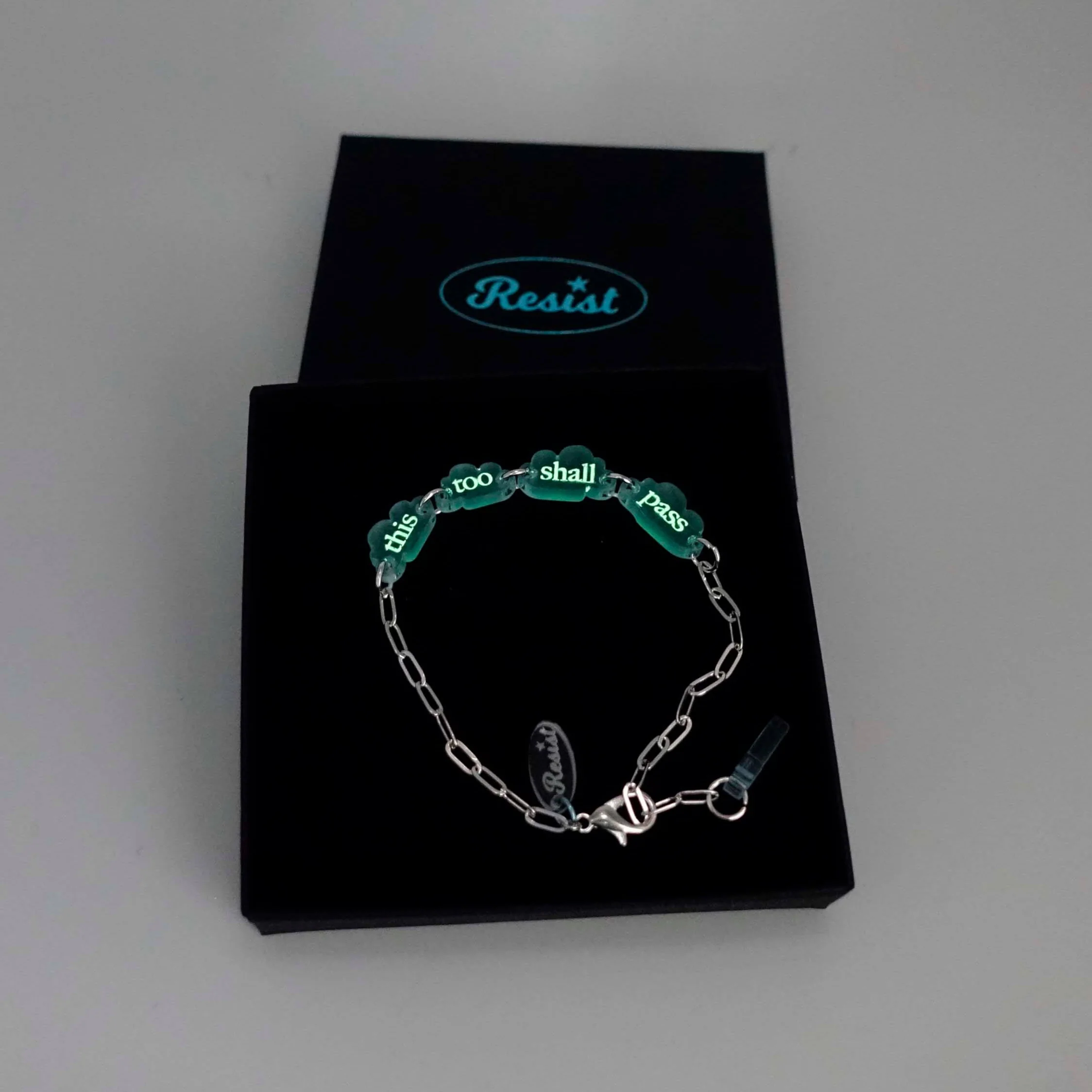 Etched with glow-in-the-dark pigment to be with you through the dark times, it comes on a delicate, paper-clip chain adjustable to any length, finished with matching lightning bolt.Â