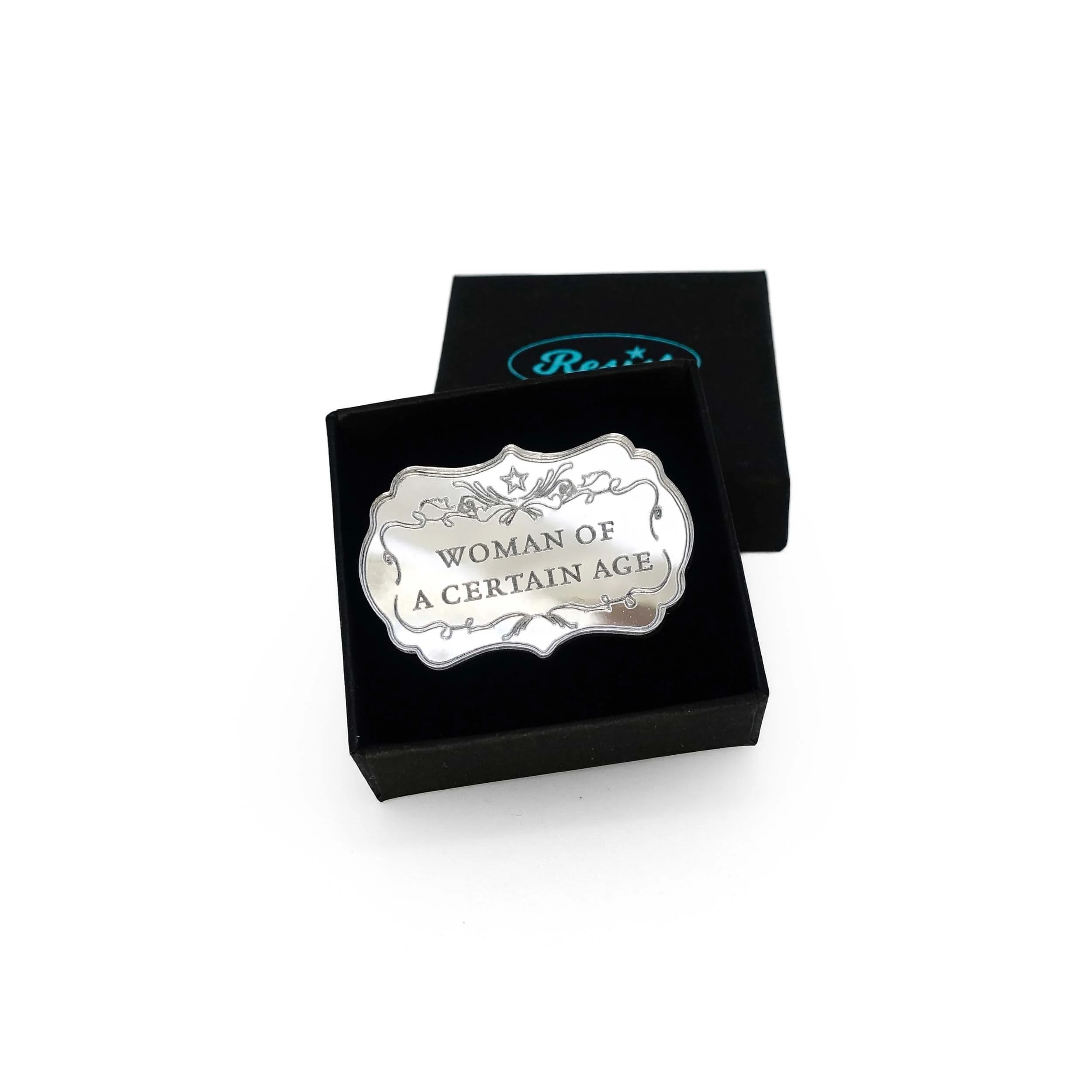 A small mirror brooch delicately etched with the words, Woman of a Certain Age.Ā